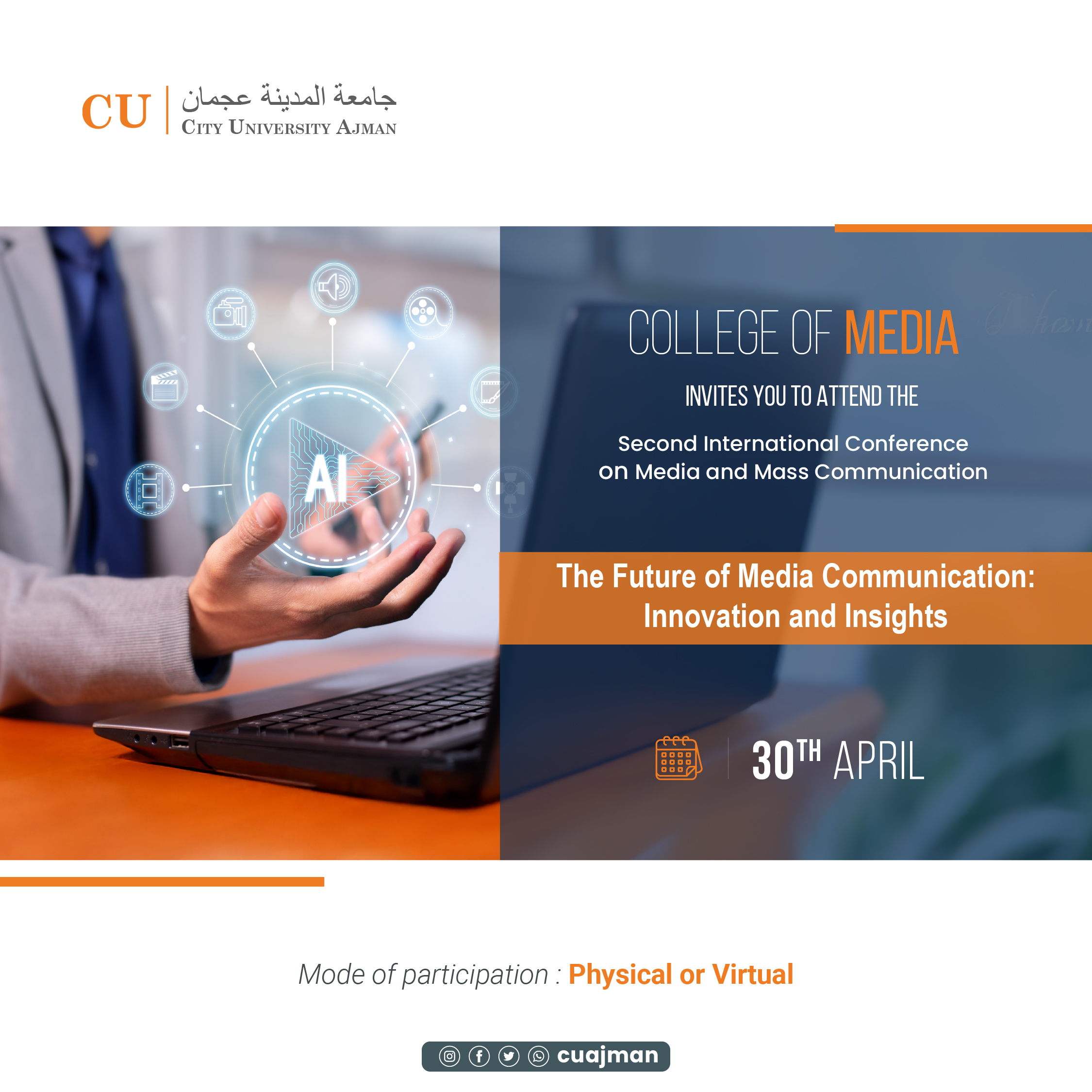 Join us at the Second International Conference on Media and Mass Communication at City University Ajman!Theme: The Future of Media Communication: Innovation and Insights Date: 30th April Mode of Participation: Physical or Virtual